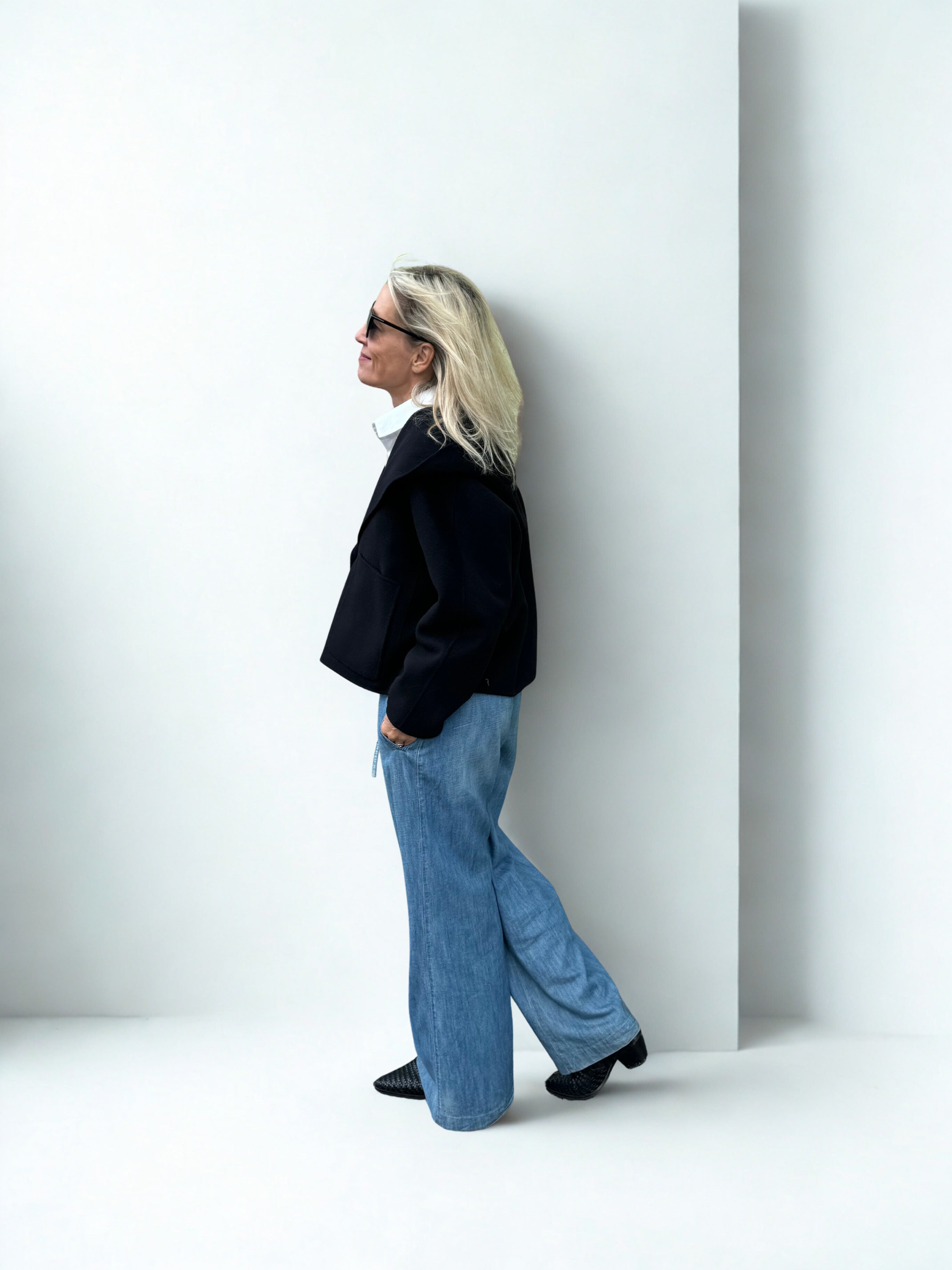 Große Krägen umschmeicheln das Gesicht. Und Schwarz ist das neue und alte Schwarz. Klassisch cool. Erst recht, wenn sie aus einer hochwertigen, warmen Kaschmir-Wollmischung genäht ist. So passt diese sehr feine Kapuzenjacke den ganzen Herbst und Winter zu Euren oversized geschnittenen Jeans genau wie zu engen Bleistiftröcken,- oder zu Cowboyboots und weiten Bohokleidern. Große Taschen und hochwertige Knöpfe sorgen für ein adäquates Tüpfelchen auf dem I. Derzeit noch einmal in M da. Auf Wunsch machen wir sie gerne nochmal - auch in Dunkelblau.