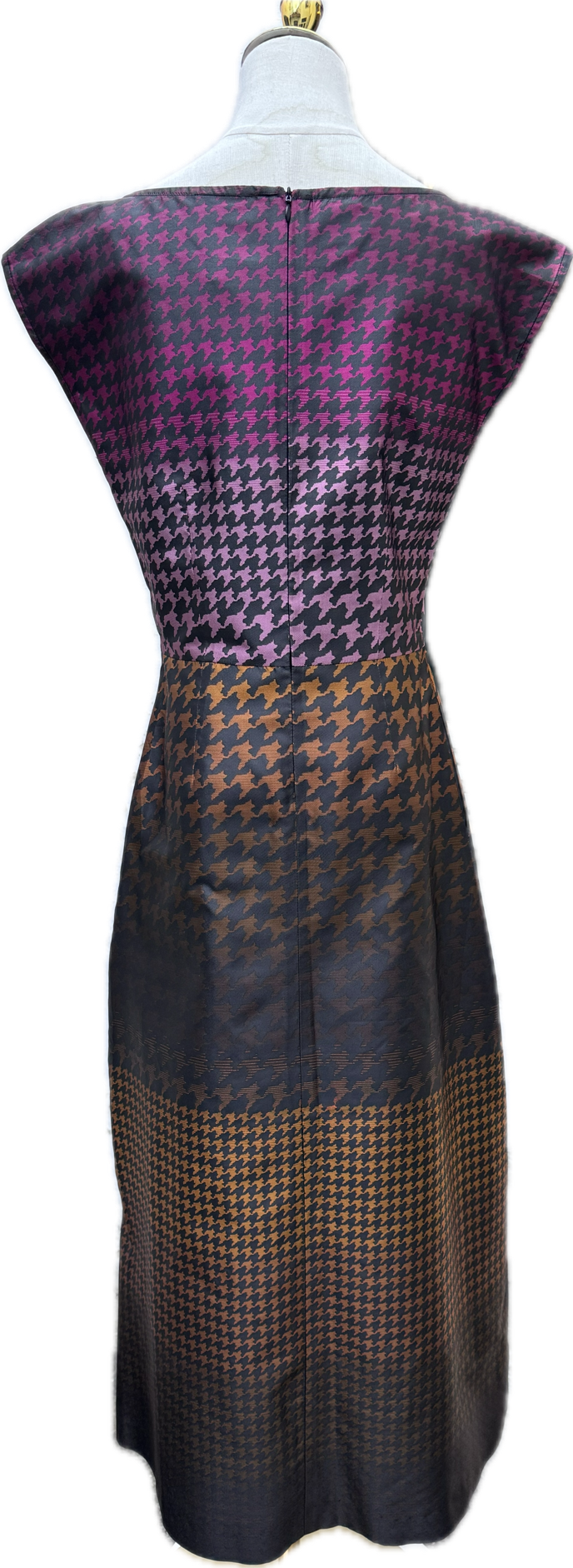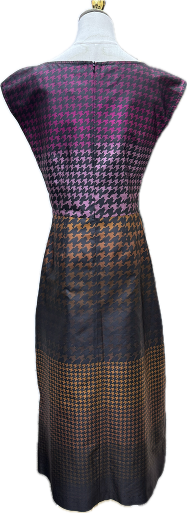 Dieses hochgeschlossene, wadenlange Kleid aus hochwertiger reiner Dupionseide in A-Linie gibt es nur einmal in Größe M. Es bringt fast alle Farben des Herbstwaldes dezent scheinend zum Strahlen. An kühlen Tagen einfach Rollkragen und Strumpfhose drunterziehen.